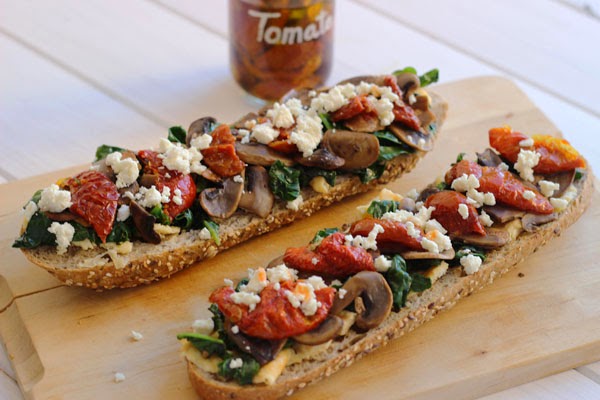 TOSTADA DE TOMATES SECOS, ESPINACAS Y FETA (receta de No más de mamá)