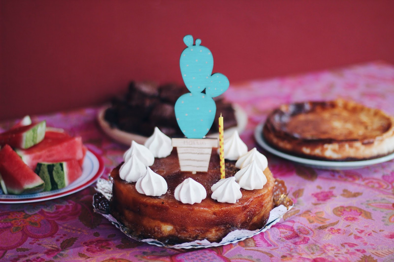 En la mesa de los postres, había un poco de todo: tarta de queso, brownie, tarta de yema, merengues y sandía (postre favorito del homenajeado).  El topper de la tarta principal fue un cactus de madera personalizado de Risbox que guardaré de recuerdo.